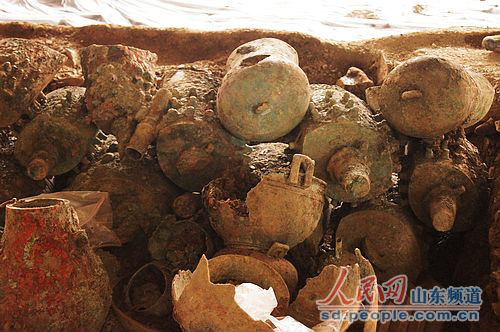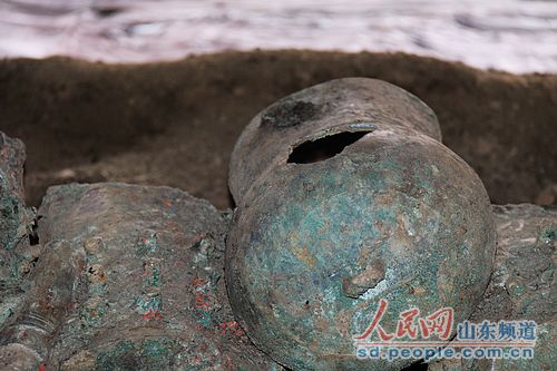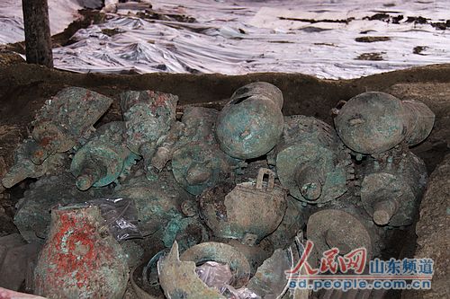 据悉,纪王崮春秋墓葬现出土甬钟10件、镈钟4件、钮钟一套9件、石磬一套10件、錞于2件。匜盘各一件,壶、提梁壶各一件,铜舟3件,鉴盂、罍、鼎等共计51件。另外已经清理出玉戈1件、玉羊首1件、金器1件、象牙器2件以及兵器铜镞、戈、斤、癸、青铜工具锛、骨簪、瑟等。主椁室正在清理之中,其中棺室内已先后暴露出1件玉璜、2件玉琮、玛瑙项饰等10余件。