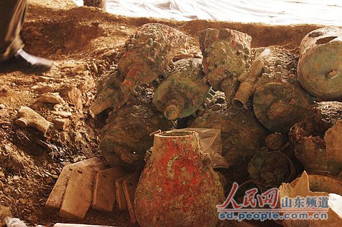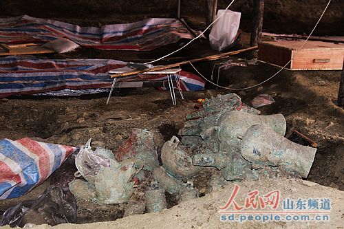 20日,我们有幸来到发现春秋诸侯王级墓葬的沂水县泉庄镇天上王城景区,详细了解了近期考古发现情况。考古现场负责同志向我们介绍说,16日考古发掘较又有较大进展。南、北边箱成堆的青铜重器基本裸露出土。从17日开始,发掘清理的重点位于南面的墓室区。我们注意到,经过一天的工作,北边箱铜錞于、甬钟、鎛钟、钮钟等青铜重器,经过考古人员用刷子、竹签细细清理,面目基本裸露出来,规整的形制和精美的纹饰近在眼前;南边箱部分鼎、鬲上原有的马骨部分已去除。考古队还对墓室西侧的一片灰痕区域进行清理,专家推测此处具有发现殉人的可能,将使本次考古价值更加令人瞩目。灰痕区南侧、南边箱西侧较大片区也在清理中。悬念最大的当数墓主的棺椁部分。经过清理,棺木上的一段横木露出土红色,看上去细密厚实,木质相当不错。令人欣喜的是,这段横木下尚有数厘米的空间,对保护棺椁之内的随葬品有好处。与它同一土层的棺椁木料基本腐朽,看上去和土差不多。