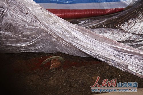 18日,考古队将继续对墓室部分进行清理发掘,尤其是对棺内的清理令人期待,可能出土证明墓主人身份的器物。出土青铜器上铭文极为清晰内容待解。其中铜鼎内壁上载有十分清晰的25个字的铭文,专家告诉笔者,其内容大体说明,该物品为何人所做,为何人所用,并可推断出为母亲送给女儿的陪嫁品,另外还有一些保佑平安的吉祥语。铜盂上有36个字的铭文,专家可以识别出有江国字样的文字,江国为春秋时期的一个国家,该国位于今河南省正阳县,距离天上王城达500余公里,该器物也有作为陪嫁品远赴山东的可能。专家说,在春秋时期,一国的公主嫁到远方另外一国的可能性是存在,但仅仅依靠这种推测仍无法判断墓主人的身份。18日下午3时左右,主棺室发掘现场传来一阵惊呼声,天上王城纪王崮春秋古墓的清理发掘工作出现了重大突破,考古人员在墓葬主棺室的东部发现了一件玉器,截至目前,这是在主棺室发现的第一件陪葬物。为了不让玉器受到损坏,考古人员在第一时间用保鲜膜对其进行了掩盖保护。据考古人员描述,这是一件有弧度的玉器,应该是玉璧或者是玉瑗。目前只清理出了几厘米的外缘,其外表圆润,上面雕刻着精细的花纹,花纹图案非常罕见,属于双勾线工艺。从露出土面的一部分可以看到,玉器紧挨颜色红艳的漆质,虽然经过了2600多年的掩埋,但玉器却没有受到周围漆质或别的杂质的侵染,依然晶莹剔透。据了解,截至目前,纪王崮春秋古墓已经发现了3件玉器,都没有被侵染。据考古人员介绍,玉器的出现使墓主人君侯级身份的推论更加稳固,根据以往的发掘经验,春秋时期这种级别的墓葬,会在主棺室棺之上椁之内、墓主人头的方向平放一件玉璧或者玉桂,它是身份的象征,只有君侯级才能使用。而目前发现的这件玉器是竖立在棺木之中,考古人员推测应该是棺板塌陷导致:“玉器穿透了椁的盖板,依然完好,说明玉器的质地非常坚硬。”玉器的发现对考古工作带来了惊喜,同时也出现了一个疑问,墓主人的头向究竟在哪个方向?考古人员告诉笔者,玉壁或者玉桂一般放置在墓主人头的方向,当前发现的这块玉器处于主棺室的东部,如果以这点来推论,该墓葬墓主人的头向可能会向东,但另一方面,该墓葬的墓道也在东面,这与以往发现的墓葬有很大的不同。据了解,前几天考古人员根据墓道在东推断出墓主人的头向可能在西面,但这块玉器的出现,又使墓主人头向出现了疑问。
