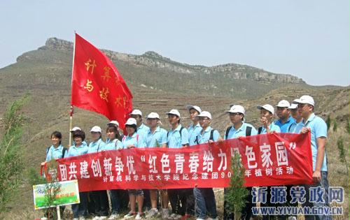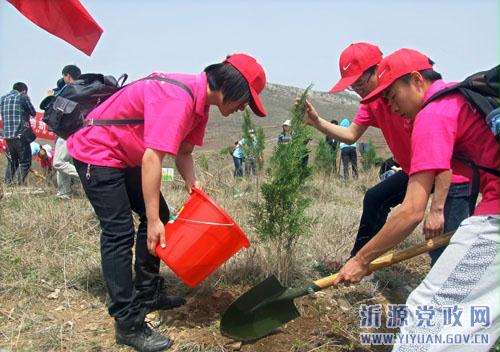 为庆祝共青团建团90周年,迎接“五·四”青年节的到来,近日,共青团沂源县委发起组织了青年志愿者植树造林活动。山东理工大学青年志愿者与该县青年志愿者共60余人参加了本次活动。图为志愿者们在悦庄镇黄崖坪村植树时的情景。(王元功 白先伟 摄)