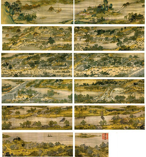 清明上河图》,绢本,墨笔淡着色,长527.8厘米,高25厘米。全卷以全景式构图,严谨精细的笔法,展现出北宋都城汴梁汴河沿岸及东角里市区清明时节的风貌。画的内容结构大体可分为三个段落:开首为郊区农村风光;中段是以虹桥为中心的汴河及其两岸船车运输,手工业和商业贸易活动;后段为城门内外,街道纵横,店铺栉比,车水马龙的繁华热闹景象。他再现了宋代城市社会生活的各个方面,不但是一幅杰出的绘画艺术作品,而且具有高度的历史文献价值。