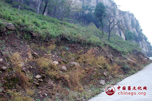 疑似人工从瞭阳崮崖壁洞穴内倾倒下来的熟土 丁军国摄