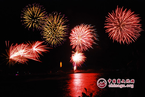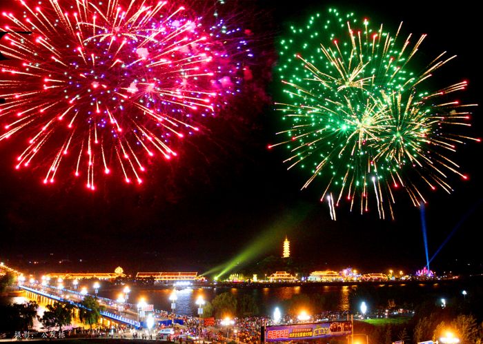端午之夜,蒙阴县在县城刘洪文化园·海浪谷举行大型焰火晚会,上万名群众沿河欣赏。