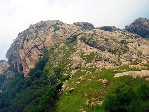 从水库到山脚下,其间有两段路颇不好走。一路走来,盘山走到一座古香古色的石头小屋那儿。首先映入眼帘的,是高处的一块突起的巨型山石,岩石的构成据说是片麻岩,既然是片麻岩,根据自己的知识我想这座山大约也有历史上亿年了吧。“山不在高,有仙则名”这座山据说是项橐的出生地,小时候姥姥和我说这山上还有许多隐藏在山中的“人参娃娃”。沿路而上,盘桓了只一会,就找到了一条进山的路。眼前的景色让人欣喜。山间小路的路边,墨绿的松林边,是大片说不出名的各种各样的野花,几株高大的树木,矮矮的小石头屋。阳光暖暖地照着,满眼金黄的暖色。在这初夏的时候,还能领略到春的色彩,天一点也不热,有种美好季节停留的感觉。故地重游让我忘掉了一切人生中的挫折,大家走累了,我让他们在大树下乘凉休息一下,我一个人小跑着去娘娘庙遗址去看了看。看过娘娘庙的遗址,一点也没觉得累。站在半山腰,看周围风云脉脉,感受天空长风清流,令人心旷神怡。由于是夏天,登山的人不多,我倒是不喜欢扎堆爬山,很多时候噪杂的人群常常打破了山景原有的韵味,那样的旅游还不如说是赶场,旅游旺季爬山用一句笑话“上山看着一片腚,下山看着一片头”就失去了旅游原本的意义。