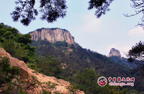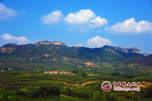 崮下山体,上部多杂树、灌木,下部为蜜桃等经济林。