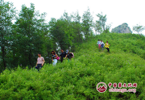 蛰伏了几天的“秋老虎”,此刻开始不怒自威,太阳也露出半个脸来,把地上的潮气蒸发得闷热无比。放眼远处,依然雾气弥漫,无法看清四周的崮。时间不长,我们个个都汗流浃背了,走在队伍最前面的是七十多岁的向导和十二岁的小朋友,这让我们很是汗颜,他们在高处歇息时,还要不停地为我们鼓劲加油。