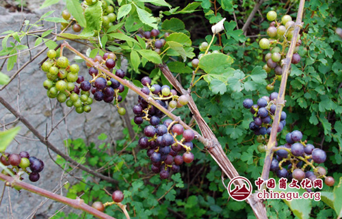 在返程的时候,向导建议我们走崮根的那条小路,看看崮下的风景。对旅游者来说,一般也是不走回头路,“登山耐险路,踏雪耐危桥”,我们岂能错过探险的机会?大家都欣然同意了,可决定好做,执行起来就难了。原有的小路,早被草木掩没,连向导也找不到了,大家披荆斩棘才能前行。因为刚下过雨,地上的泥土湿润,斜坡上的石头也是杂乱、活动的,很容易滑倒,大家接二连三的大呼小叫着,与大地亲密接触的人也越来越多。我的军用鞋在关键时候起到了作用,每一步都能稳扎稳打,让我随时可以帮助美女们。虽然大家相互搀扶、扶持,依然险情不断。不过,惊险之余,我们也欣赏到独特的风景,几株野葡萄硕果累累,紫的红的,争相挂满枝头。看这样子,野果已经成熟了,大家纷纷前去摘取、品尝。从崮下看,山崖几乎是竖立的,不时有花草树木点缀着,悬崖便多了几分俏丽,没带相机的,也用手机拍起来。再往前走,在崮根处又看到了野生的软枣、梨,虽然无人管理,梨子的个头小,也被小鸟啄得有了伤痕,但甜脆的味道让人满口余香。荆棵、益母草、艾蒿、翻白草等药草都绽放着花朵、散发着香气,这里的数量比崮顶又多出数倍,叫不上名字的草木随处可见,小鸟也不时飞过,此情此景,居然让不是诗人的我也萌生了诗意:花英草色处处艳,鸟语虫声时时鸣。