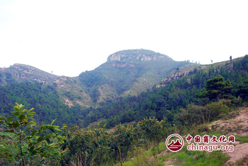 事情总有解决的办法。就在这时候,后边跟上来一位牧羊的老人,大约六十左右年纪模样,瘦瘦的,黑黑的,个子不是很高。他一手持了鞭子,赶了二十多只山羊上山。得知大家来意,向东指指,示意大家往东走。这是一片沙石岗岭,山上一色松柏,不间杂一棵其他乔木。大家跟了老人,老人很健谈。第一句话却是:“阁老崮上挂淤柴,淹了蒙阴和新泰。”看到大家面面相觑,老人解释说,这是说明阁老崮高的意思。大家不知路途远近,心里没底。一边走着,就有人问起来。老人告诉大家,爬到崮顶大约需要50分钟的时间。一路上攀谈着,从他那里还得知:阁老崮位于蒙阴县野店镇西南8公里,西为高都镇境,海拔610米,石灰岩地层,因崮形似古时阁老帽子而得名。崮项四面陡峭,西侧岩层高达40米,周长500米,崮项面积25亩,有东、西北二门,上有民国碑刻两丛,为金、元以来历朝山寨文化遗存。