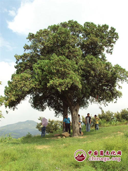 途中,会长告诉左边山坡上有两棵大小相同的柏树,树龄已久、长势茂盛,号称情侣树。我们不愿错过机会,停车攀上山坡,来到跟前,果然有看头:两棵墨绿的树冠交织在一起、粗壮的树干距离两米左右的大柏树,粗细、高矮、形状极为相似。不知起自何年,就这样相依相伴到今天,在周围没有树木的山地间,它们显得尤为珍奇。