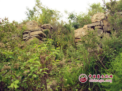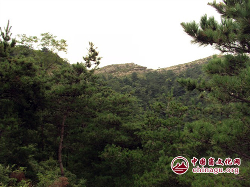 我们与牧羊老汉合影后继续攀登,来到崮跟,向南一望,方知各老崮面积也不小,整个山崖符合岱崮地貌特征,周围一圈都是悬崖峭壁。登上坡度不很大的西山膀,发现上面植被多为侧柏。登顶还有一大段路程,越过百多米布满柏树、荆棘的坡路,终于来到了各老崮巅峰跟前,首先映入眼帘的是那座残破的寨门,寨墙虽破,有的地方还很高,尚且完整,足有三四米,我们拍照后,越过寨门,爬上巅顶。