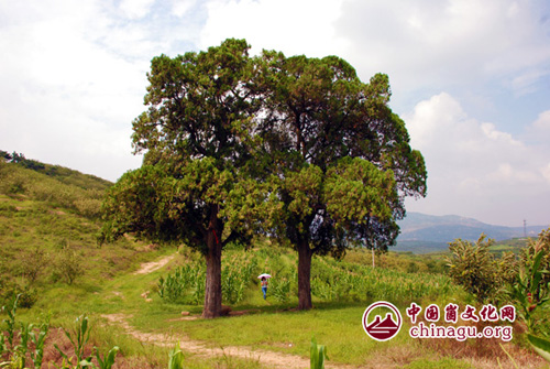 来到坡上,在坡的东一面,只见两颗苍翠的侧柏,静静地并肩而立。一阵清风拂过,枝叶婆娑,像是相恋的一对情侣在喁喁私语。这两棵树,树干笔直,树龄怕是要有数百年了吧!树冠硕大,华冠如伞。它们的枝叶在空中相握,根在地下相连。微风吹来,它们含笑相互致意;山雨袭来,它们深情相伴相依。红尘里的爱情有多少沧桑无奈;尘世间的情缘有多少虚幻疑猜......而在日月轮回里,在星辰变换中,它们却朝夕相处,相依相偎,不离不弃。前天是七夕,牛郎织女鹊桥相会。他们也一定在这两棵树下歇息过吧!你听,此刻,仿佛还听得见,他们树下喃喃的细语……