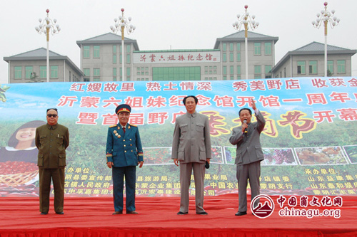 9月22日,沂蒙六姐妹纪念馆开馆一周年庆典活动在六姐妹家乡——蒙阴县野店镇烟庄村举行。中国四大伟人毛泽东、周恩来、朱德、邓小平特型演员扮演者惊现庆典现场,同台献艺,受到老区观众的热情欢迎。演出期间,“四大伟人”还走下舞台,与沂蒙六姐妹中健在的伊淑英、张玉梅、伊廷珍一一握手,亲切交流。透过“四大伟人”声情并茂的表演,让人仿佛又回到了那段难忘的烽火岁月,深深感受到老一辈无产阶级革命家与沂蒙老区人民血脉相连的浓浓亲情。 (丁军国 摄)
