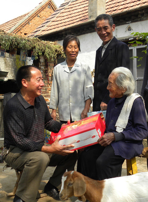 中秋节日临近。蒙阴县远通达车辆有限公司总经理秦元军,来到常路镇东下庄村,为101岁的刘玉秋老人送上月饼和豆奶粉,并请来医务人员为老人进行健康查体。 蒙阴县远通达车辆有限公司建于2009年,主要生产载重量最强的轻型挂车,小鹅颈重型侧翻自卸车及汽车二类底盘改装等,产品远销全国各地。公司总经理秦元军富裕后,不忘家乡父老乡亲、不忘回报社会,他一直在热心关注并投身家乡的扶贫及慈善公益事业。今年中秋节来临之际,秦元军买来月饼、牛奶等慰问品,除了看望镇敬老院的13名孤寡老人外,9月25日,带着慰问品来到东下庄村看望了101岁老人刘玉秋,并请来社区的医务人员,为老人进行了健康查体。秦元军将月饼送到百岁老人刘玉秋手中时,老人脸上绽开了灿烂的笑容。