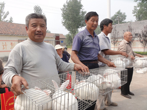 为拓宽残疾人关爱渠道,鼓励他们自主创业,蒙阴县在全县实施“整村赶平均”工程。即“整村推进贫困残疾人家庭生活水平赶上所在村平均水平”工程,计划用5年左右的时间,使全县80%以上村的贫困残疾人家庭人均纯收入、住房条件等指标,赶上或超过所在村平均水平。工程由县残联组织实施,并根据不同的发展基础和条件,扶持农村贫困残疾人能够人手掌握一门技术,以增加农村残疾人贫困户的收入,使残疾人家庭生活水平赶上所在村平均水平。扶持发放的优质獭兔种兔,就是“整村赶平均”一项工程的内容。目前,已向6个村的120户残疾人贫困家庭赠送了优质獭兔种兔。图为垛庄镇红日村的残疾人家庭在领取獭兔种兔。(匡秀夫)