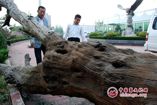 笔者看到,该树木通体红褐色,材质坚硬,纹理古朴沧桑,树干上其中一段分枝留有明显的陈旧锯痕,应为人工所留。据介绍,该树沉埋于梓河旧寨乡境内北楼段河床中心,去年9月,施工人员动用大型机械在此河中取沙,挖至20多米以下河床时,挖掘机碰触到硬物,起初施工者以为是石头,仔细一看,原来是一段粗壮古木,但多次迂回,变向挖掘,始终挪动不了古木的位置。施工人员遂顺着树枝在周围进行开掘,随着施工进展,一棵完整的巨大古树逐渐露出面目,引的周围村民纷纷前来观看。如此庞然大物,在河道底部,要想运送出来,绝非易事。施工者找来多辆大型机械,拴上油丝绳,连拉带拖才将其弄到公路上。在此之前,当地村民也曾在同一地点挖出过几棵树形相对小些的枣树。