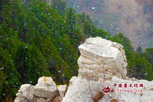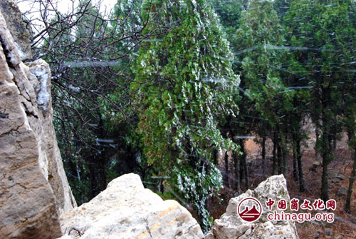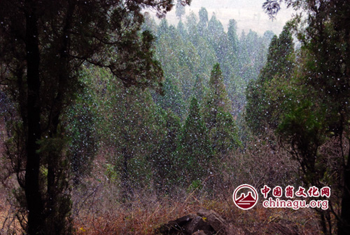 位于坦埠镇地势较高的云头崮,崮坡上茂密的侧柏林里,洁白的雪花与翠柏相映衬,静静的飘落,而在崮顶,山风裹挟着飞雪,肆无忌惮的袭来,钻进人的鼻孔,迷住了人的眼睛,不一会,树上、岩石上、野草上已是银装素裹,好一派北国风光。据当地村民讲,九月天里气温骤降属正常,而下起如此大的雪,则是罕见。(丁军国摄)
