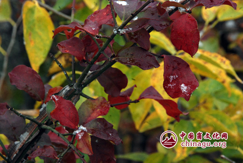 晶莹的雪花与秋叶相互映衬,格外美丽