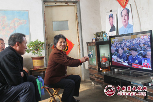 11月8日上午9时,中国共产党第十八次全国代表大会在北京隆重开幕。地处沂蒙山腹地的蒙阴县旧寨乡上河村,今天一大早,“十八大” 代表、精武标兵张茂春的妈妈徐志英早早的坐在电视机旁,认真收看十八大开幕盛况。开幕式上,兵妈妈徐志英看到自己的儿子端坐在会场上,高兴之情溢于言表。同时也让这位兵妈妈以及家人倍感自豪。 在接受采访时她操着沂蒙口音说道:“感谢党的培养,感谢部队的关怀使儿子一步一步的成长起来。希望儿子不负众望,在部队干好工作,为部队争光、为家乡争光”。