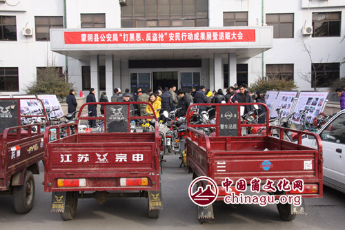 崮文化网讯 12月19日上午,山东省蒙阴县公安局举行退赃大会,向群众展示深化“打黑恶、反盗抢”安民行动成果,将在近期办理的案件中追回的1辆奥拓汽车、11辆摩托车、27辆电动车等价值11万的物品公开退还给失主。 (丁军国)