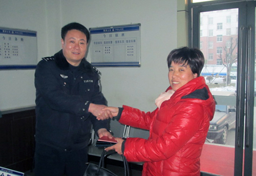 失主高兴地从民警手中领回装有巨额存单的提包