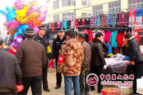 为使崮乡群众赶上“放心集”,过上“平安年”,山东省蒙阴县公安局垛庄派出所根据集市上人、财、物流量较大的现实状况,采取可行措施,联合镇驻地商业街治安积极分子组成巡逻队,在集市开展巡逻活动。