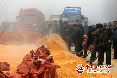 崮文化网讯 1月30日11时许,一辆满载40吨玉米的河南籍斯太尔大货车在山东省蒙阴云蒙湖跨湖大桥附近侧翻,玉米粒全部洒落,宽阔的路面瞬间变成了一个偌大的“晒粮场”。