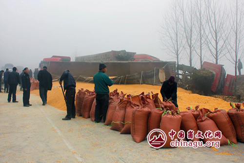 事故发生后,蒙阴县公安局巨山派出所民警迅速赶至现场,制止哄抢,并将围观群众疏散。经了解,该车是从河南省运送玉米粒前往山东莒县,因雾霾天气路面湿滑,在下坡时躲避相向行驶的一辆农用车刹车过猛导致车辆侧翻。附近有群众看到散落的玉米没及时清理,便到事故现场围观。为防止出现哄抢,民警在控制现场秩序的同时,又帮助货主多方联系,找来装载机和货车,至下午三时左右,才将散落的玉米全部转运出去。交通恢复畅通后,民警才离开现场。(丁军国 李兴发摄影报道)