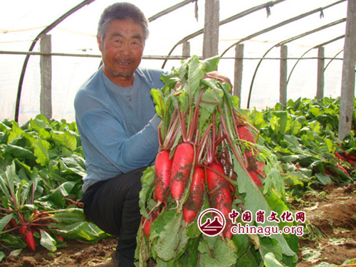 崮文化网讯 近日,蒙阴经济开发区曹庄社区水萝卜喜获丰收。该社区种植水萝卜面积近400亩,有20年的历史,已经形成了规模化、科学化、市场化种植。水萝卜从育种、出苗、收获仅60天,每亩产量为6000斤左右,仅此一项该社区可实现产值400多万元。图为菜农正在收获水萝卜。(孙妍)