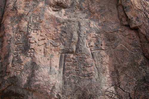 另有清末“人世蓬莱”刻石,至今仍清晰若初。题刻于风动石内侧,石阶路边的赭色峭壁。字旁行而排列起伏有变,生动自然,字大斗方,体隶书,古朴秀丽,苍劲挺拔,镌刻形式双勾。末刻款识,小字阴文,直排两行:“同治乙丑,了一子书。”石刻虽寥寥四字,却真切活现地道出了沂山歪头崮山水奇异,云雾竟年,如同东海仙境蓬莱。