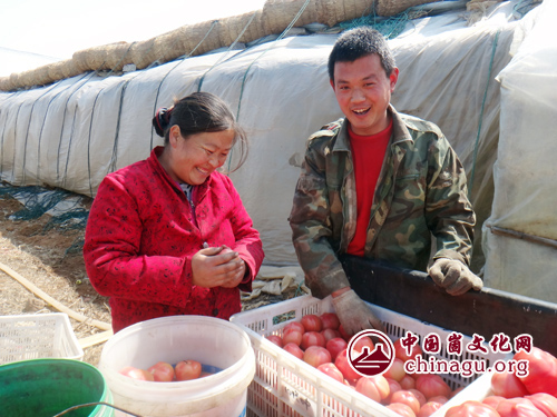 崮文化网讯 目前,正是大棚蔬菜大量上市的季节,山东省蒙阴县桃墟镇大庙村的大棚蔬菜喜获丰收。 这个村是库区移民村,在村民由于岸堤水库蓄水而失地后,桃墟镇积极引导大庙村民利用有限的土地资源发展高效农业,帮助该村村民提高效益、打开市场,还为大庙的西红柿注册了“兴蒙”牌商标。大庙村民依靠大棚蔬菜走上了致富路。图为村民正按大小、成色的不同把西红柿分级装箱。(卢永洁)