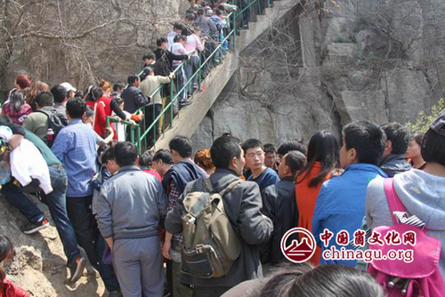 在熊耳山裂谷入口、抱犊崮登崮天梯入口人头攒动、举步维艰。景区为避免拥挤,短时间采取了限制客流的应急措施,以确保游客安全。景区假期开展了第三届熊耳山民俗文化节、樱桃采摘、抱犊崮八路军第115师红色旅游文化演出等丰富多彩的红色旅游、乡村民俗游活动,吸引了周边游客前来踏青、赏民俗、采樱桃。