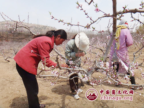 崮文化网讯 近日,随气温逐渐回暖,蒙阴县桃墟镇 10000多亩桃园中的桃花蓓蕾初绽,浓香沁脾。由留守妇女们组成的妇女打工队活跃在各家桃园中,开始对桃花进行人工辅助授粉,成了农忙时节的生力军。像人工授粉这样的活,一天的工钱是80元,中午还管一顿饭。妇女们着实在家门口当起了收入不菲的“蓝领”。
