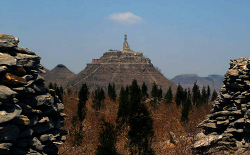 如今我见到的锥子崮,是已经被破了金身的石体,石阶是人修的,两道大门是新建的,处处有道教文化的显示与标志。锥体东面悬崖处,有一排新修的还未启用的房子,看样子是将来办公或经营的场所。没有服务和管理人员在场,只是在崮周边的梯田里,有零散人员在整修道路或培育花草。现象表明,这里是已有人投资而正在开发的以崮为载体的崮文化与道教文化相结合的文化娱乐产业。我的理念与投资者相悖,相临的纪王崮上已进行了全面科学有序的开发,保留一座原始的锥子崮会更好。其他我不再多说。