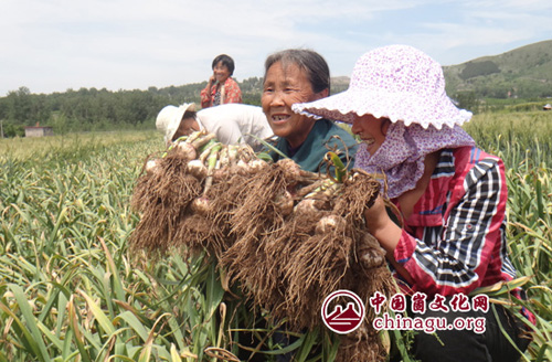 等特点,是淹制、做菜、配料的上好佳品。 图为蒜农正在抢手成熟的大蒜。(王蕾