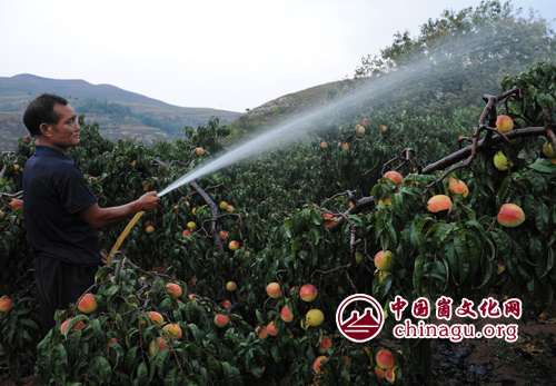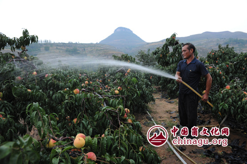 崮文化网讯 9月21日清晨,在岱崮地貌核心地南岱崮山下的蒙阴县野店镇翻金峪,果农正在山地里给寒露蜜桃喷水,确保蜜桃能增产增收,卖个好价钱。 翻金峪村是蜜桃专业村,仅蜜桃一项年户均收入就达3万元以上。今年该村晚茬寒露蜜桃长势良好,红艳艳的桃子个大饱满,丰收在望。但由于秋季以来,天气干旱少雨,摘袋后的蜜桃急需补充水分,增加甜脆度。在政府部门的指导下,果农立即行动起来,克服靠天等雨思想,掀起浇水抗旱高潮。确保树健壮,果优质,能增收。图为果农丁善为正在山上给蜜桃喷洒“增甜水”。(丁军国 摄影报道)