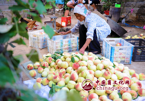 崮文化网讯 近日,位于岱崮地貌核心地的蒙阴县岱崮、野店、旧寨等乡镇中华寿桃、永连蜜、寒露蜜等晚熟品种蜜桃喜获丰收。市场价格每公斤分别为6元、4.8元和5.6元。图为9月28日,野店镇翻金峪果农正在挑选从田间挑来的蜜桃,准备运送到收购点出售。(丁军国 摄)