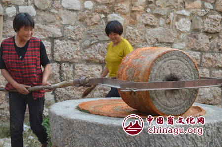 崮文化网讯 金秋时节,在沂蒙崮乡山东省蒙阴县常路镇杏泉村的两盘石碾旁,聚集了很多等待碾椒花的妇女们,碾盘上厚厚的一层椒花酱,颜色诱人,那浓浓的香味便弥散在村里的大街小巷。椒花在当地称为椒子花,用鲜嫩的韭花和红辣椒、盐、花椒叶合成,碾压时把这些原料均匀地撒在碾盘上。碾压好的椒花酱要放在密封的坛子里,发酵上十天后,就可食用,打开坛口,浓郁的椒花酱香扑鼻而来。该村的人们除了自己食用和送亲朋好友外,有的还将椒花酱销到镇上的饭店和超市。(张纪增