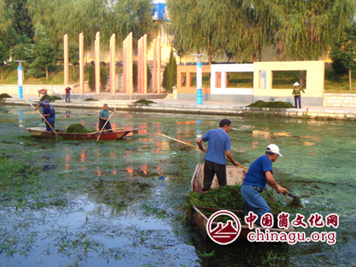 崮文化网讯 为还河道“清白”,连日来,蒙阴县汶溪公园管理处组织公园工作人员对汶溪河道上的水草浮萍进行集中打捞和清除。平均每日出动打捞人员12人次,打捞船3艘,垃圾运输车辆1台。截止目前,共清理河段1200米,打捞水草、青苔、垃圾漂浮物60余立方米。同时,也呼吁汶溪河沿河两岸居民、经营户要强化卫生意识,大力推行“垃圾袋装化”,集中处理各类垃圾,减少河道垃圾源。图为汶溪公园工作人员正在打捞下庄桥南坝水面上的水草浮萍。(张树宏)