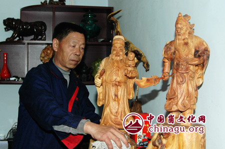 崮文化网讯 栩栩如生的关公,慈眉善目的福禄寿三星,惟妙惟肖的骏马……这些精美绝伦的根雕艺术品,都是蒙阴县坦埠镇沙沟村村民公茂卿珍藏的宝贝。问起他是怎么想起搞根艺收藏的,公茂卿显得特别兴奋,他说:“我年轻的时候就喜欢根雕,那时候穷,买不起。这几年党的政策好,我做了点小买卖,手头富裕了,这才能把‘压抑’了多年的爱好‘翻腾’出来,没事的时候摆弄上几下……”(秦立华 摄)