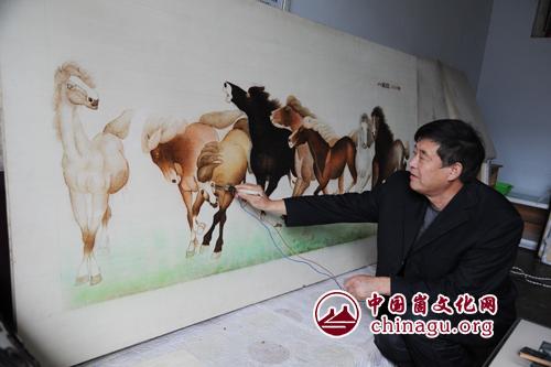 崮文化网讯 用自制的烙铁笔,在木板或纸上烙出各种精美的画,令人赞叹不已。在山东省蒙阴县城一个小巷里,民间艺术家孙胜运正在家中为他的新作《八骏图》做最后的修饰。 这幅在木板上用烙铁一笔一笔描摹出的巨幅画作《八骏图》,造型生动,栩栩如生,采用工笔加套色技法,历时15天完成。寓意:马到成功,事事顺利,被一房地产开发商出资收藏。 孙胜运是岱崮地貌核心地坡里村人,自幼喜欢画画。1983年至1986年在天津美术学院进修,求学于著名画家冯士松。从1981年开始,孙胜运自制烙铁为烙画工具,在木板和纸上运用工笔、素描、水彩加套色等技法,以岱崮地貌和当地人文风情为背景,创作了大量烙画作品。大众日报、临沂日报、中央电视台经济频道、临沂电视台等多家媒体先后专题报道。(丁军国)