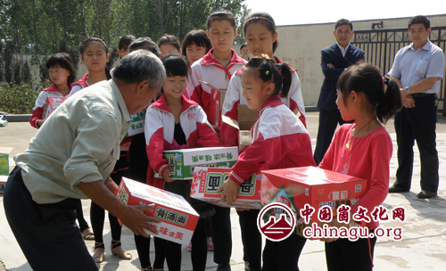学生们为孟良崮敬老院老人们送来鸡蛋、茶叶等生活慰问品。