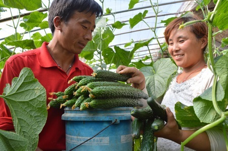 崮文化网讯 11月17日,蒙阴县常路镇德财蔬菜专业合作社的社员正在忙着采摘秋延迟黄瓜,脸上露出丰收的喜悦。近年来,该社根据市场需求,巧打时间差,大力发展秋延迟黄瓜。在管理上,积极引导社员进行标准化生产,应用测土配方施肥技术,大力推广有机肥及生物肥料的使用,所产黄瓜以品质优,口感好,香脆味美,无公害,吸引了大量客商前来收购。目前,该社种植的2000多亩秋延迟黄瓜,以每公斤3元的价格俏销市场,取得了良好的经济效益,仅这一季亩收入达到2万元。(张纪增) 崮文化网独家稿件 转载必究