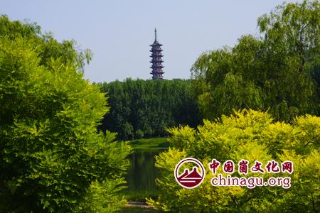 夕阳宝塔水渺绿柳白荷鸣鸟壮观挺拔曼妙金光封照寻梦人在古道