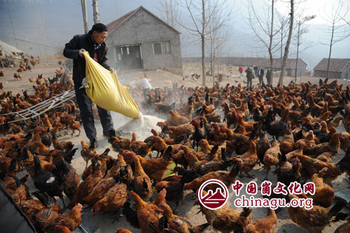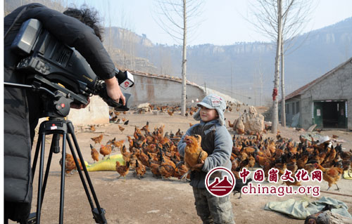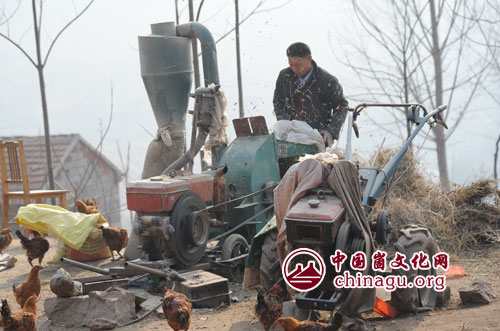 前些日子去观摩考察过廉仕财的大崮山农场,这次前往,适逢山东电视台采访他。令我们有了新的感受的是,品尝到了现场烙制的喷香的地瓜干和纯小米煎饼。令我们进一步开眼界的是他粉碎山草做饲料和喂鸡的情形,那繁忙热闹的景象真是难得一见!粉碎机由柴油机带动,廉仕财手摇开柴油机,柴油机、粉碎机的轰鸣声,震天价响!他把一捆捆山草送进粉碎机,粉碎机上的长筒布袋不断地鼓胀。这时,已有不少的鸡凑拢到机器的周围,有的竟然在飞速的传动皮带下悠然地踱着,它们在等待着享用即将粉碎的饲料。不一会,一大堆山草就粉碎完了,机器停了,不等廉仕财在山草饲料中加进些粉碎的粮食,一些鸡就抢食开了。廉仕财拌好鸡食,放嗓吆喝几声“小鸡咾好吆——”,有的从柴草垛里、有的从鸡棚里、有的从山坡上,上千只鸡从四面八方飞奔着千军万马般、潮水般涌来,壮观的场面让从城里来的小朋友兴奋激动得欢呼跳跃起来,大人们也无不称奇!