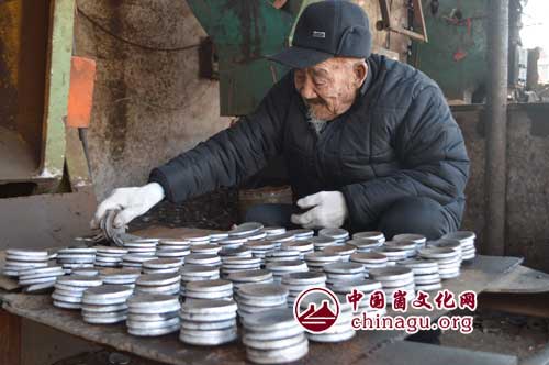 老人在儿子的厂里安装配件