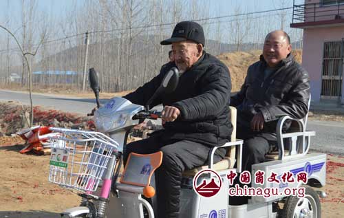 刘安营老人骑着电动车拉着儿子去走亲戚