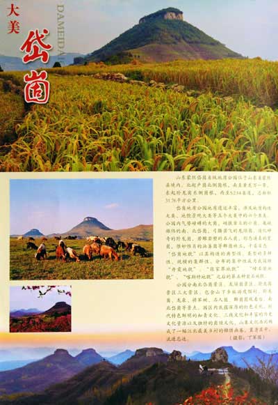 崮文化网讯 近日出版的2014年第3期《沂河》杂志以《大美岱崮》为题在封二整版刊登了蒙阴县崮文化研究会丁军国拍摄的岱崮地貌风光图片。《大美岱崮》对岱崮地貌的地理位置、地质地貌特征以及旅游开发情况进行了全面的介绍,起到了很好的宣传推介作用。