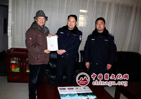 崮文化网讯 1月16日上午,原蒙山国家森林公园管理局局长,县诗词学会会员公方景将一封感谢信和自己出版的岱崮地貌书籍送到蒙城派出所民警手中,感谢民警帮其找回丢失的手提包。