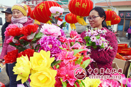 大集上,品种繁多、各种各样的绢花争奇斗艳,似乎还散发着芳香,吸引着大量的顾客,绢花销售十分红火。人们购买仿真丝绢花在节日里装扮居室,迎接羊年新春到来。据了解,象征富贵的牡丹、金钱串花等仿真丝绢花最受顾客青睐。(张纪增)