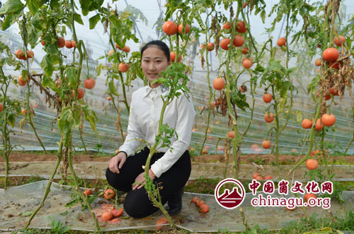 暂且先不谈吃,就是进到大棚里面看看,也会被那景色所陶醉。十来米高的钢架结构托着塑料薄膜,宽敞而明亮。足足有几亩的大片土地上,叶宽茎壮的一畦畦韭菜,泛着光亮,充满生机的翠绿早已沁入心扉。再看那株株高达两米的西红柿,从根到稍挂满了熟透了的红灯笼似的果实,喜庆的氛围让人心花怒放。有璞玉般朴实、温存端庄、隽秀优雅的小城姑娘,怜爱美景,拍照留念,场景让人赏心悦目。